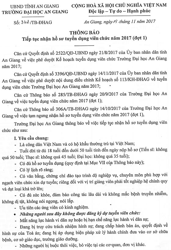 Căn cứ Thông báo số 306A/TB-ĐHAG ngày 14/10/2017 của Trường Đại học An Giang về việc tạm ngưng nhận hồ sơ tuyển dụng viên chức năm 2017 (đợt 1),