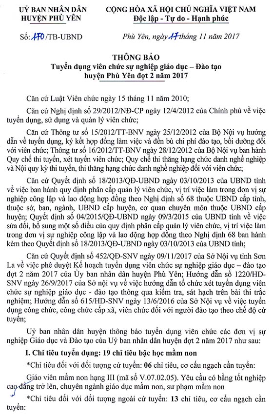 UBND huyện Phù Yên, Sơn La tuyển dụng viên chức giáo dục đợt 2 năm 2017 như sau: